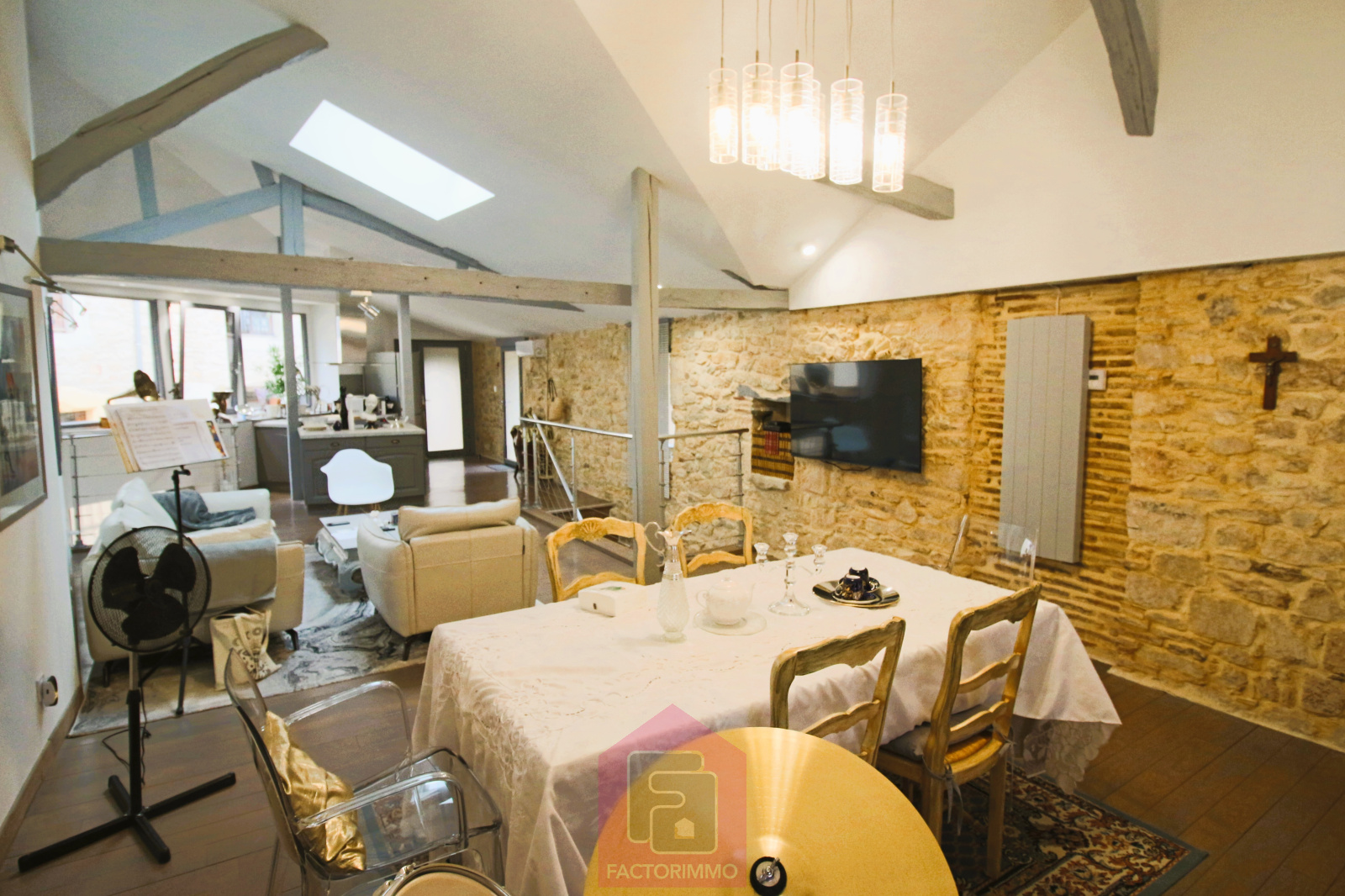 d’une pièce de vie lumineuse avec pierres apparentes et poutres mises en valeur,